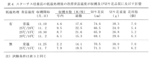 - 「サンデーライトブルー」では、低温処理後の冷房育苗温度は昼温を25℃とした場合、夜温は20℃で抽だいが早くなり、苗の葉数が増加する。また、年内採花本数および総採花本数は、夜温10℃では少ないが、夜温20℃及び15℃では多くなる(表3、表4)。
