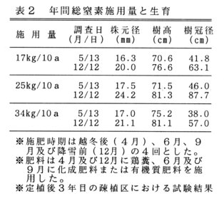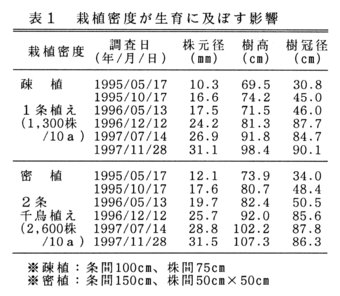 - 栽植密度は疎植(1,300株/10a)とするのがよい。密植(2,600株/10a)とした場合は、個体の生長に伴い隣接する株同士で枝葉が接触するため樹冠の拡大が抑制される(表1)。