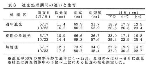 - 高温期の葉焼け防止のために遮光処理(遮光率60%)を施すと、生育は良好となり樹冠が拡大する(表3)。ただし、通年遮光すると徒長枝の伸長により草姿が乱れるため、遮光は夏期のみ(6~9月)にとどめる(データ省略)。