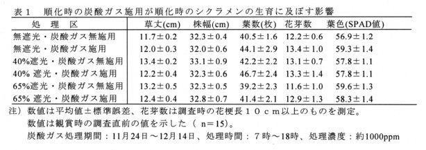 - 観葉植物をはじめ、花を観賞の主体とする鉢花でも、観賞時の葉色低下あるいは黄化葉の発生の低減には、遮光による順化処理が有効である。ところが、鉢花に対する不適切な遮光処理は、しばしば花数の減少、茎部の徒長などの品質低下を引き起こす。そこで、順化時の遮光下でシクラメンに炭酸ガス施用を行うことにより、これらの品質低下を防ぐとともに、観賞時の日持ち性を改善する。