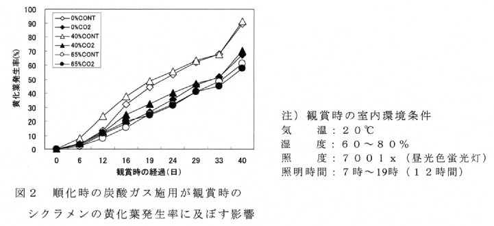- 無遮光区、40%遮光区での観賞時における黄化葉発生率は、炭酸ガス施用区で減少する(図2)。