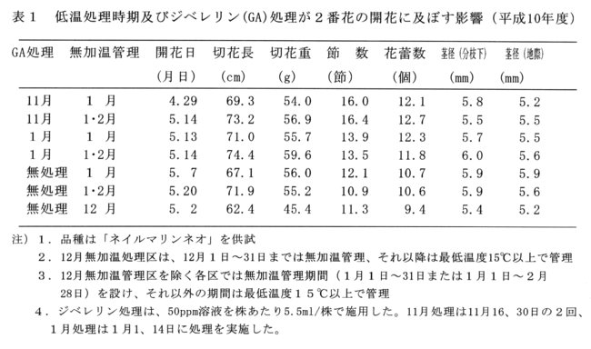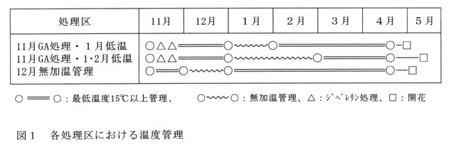 - 切り下株に11月にジベレリン処理を行うとともに、12月まで最低温度15℃で管理し、1月の1ヶ月間程度無加温管理し、再び2月から最低温度15℃以上の温度管理を行うことにより、切り下株を1か月程度無加温管理した場合とほぼ同時期の開花が可能である(表1)。