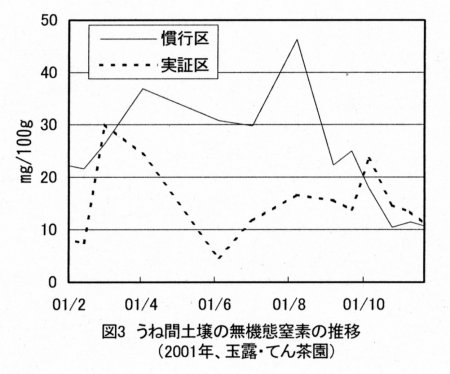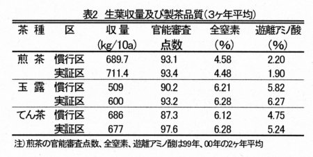 | [要約] | 春期の低温条件下でも溶出する被覆肥料∑を1月中旬に施用すると、2月中旬頃から窒素成分が溶出し、一番茶新芽に対する肥効が確保できることから、年間窒素施用量を煎茶で76→60kg/10a、玉露・てん茶で120→75kg/10aまで削減しても、品質、収量は維持、向上する。 |