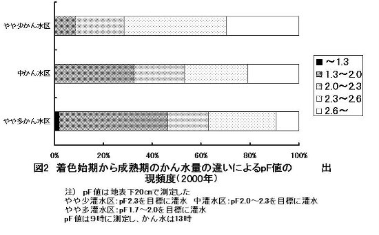 | [要約] | カキ「刀根早生」のハウス栽培において、かん水量を増やすと肥大は優れるが着色が遅れ、脱渋後の軟化が増える。着色始期から成熟期にpF2.3~2.6程度になるようかん水量を減らすと、脱渋後の果実の軟化の発生を抑制できる。 |