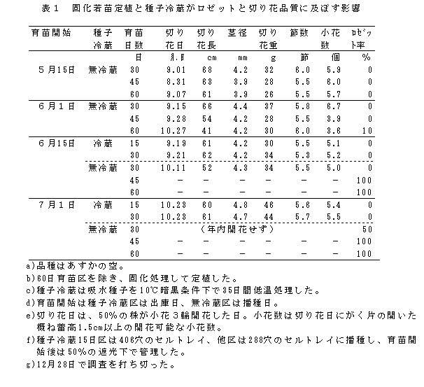 | [要約] | トルコギキョウの秋出し作型では、固化剤を利用した若苗定植と種子冷蔵を併用することによって、ロゼットが回避され切り花品質が向上する。 |