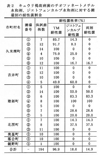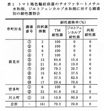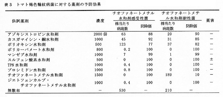 以上の結果、トマト褐色輪紋病菌とキュウリ褐斑病菌のチオファネートメチル水和剤耐性菌にはポリカーバメート水和剤、TPN水和剤など数種薬剤が有効である。
