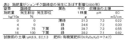 | [要約] | シュンギク額縁症は塩類濃度(EC)の高い土壌で発生しやすく、マンガンの吸収量が少ないために発生することが明らかになった。硫酸マンガンの土壌施用や葉面散布により、葉の緑色が濃くなるとともに額縁症の発生を防ぐことができる。 |