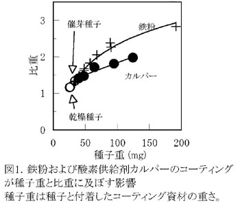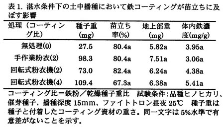 | [要約] | 水稲種子は鉄粉の湿粉衣により容易に加重され、その比重は2~3まで高まる。鉄コーティングは種子の生育を阻害せず、湛水散播において浮き苗の発生を抑制する。 |