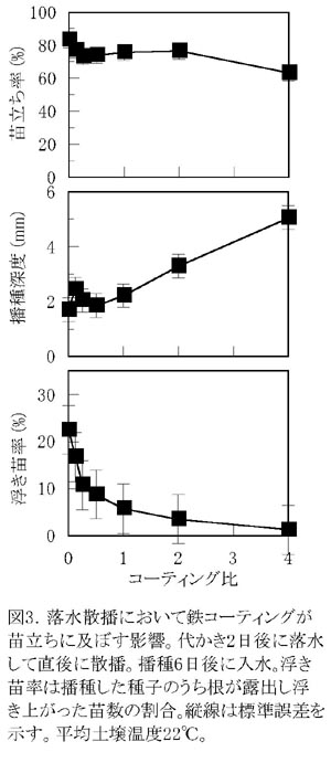 | [成果情報名] | 湛水直播水稲における種子の鉄コーティングによる浮き苗回避 |
