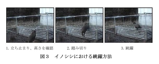 | [要約] | 餌付け・誘導により、野生イノシシの跳躍能力を測定できる。成獣は、高さ120cmの障害物を飛び越えることができる。生後半年の幼獣においても、代表的な防除技術であるトタン板の高さ(65cm)を飛び越えることができる。餌の獲得を目的としたとき、イノシシは助走しないで障害物を跳躍する。 |