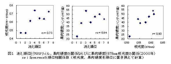 | [要約] | 果実の冴えには、果実の緑色、果粉の厚さ、果肉の硬さの3要因が大きく影響している。冴えの良い果実は冴えの悪い果実に比べて、クロロフィルが少なく、果粉が多い傾向にあるとともに、果肉が硬く、光の反射率が高い傾向にある。 |