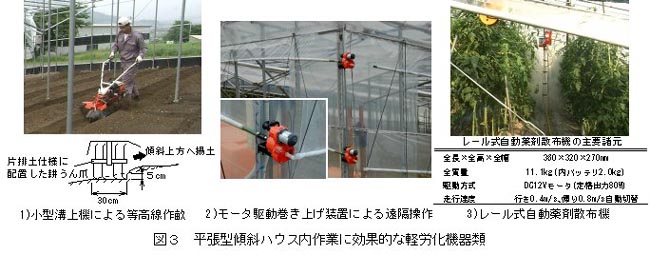 | [要約] | 高軒高構造の平張型傾斜ハウスは、斜面風の取り込みが優れているため、作業者の身体負担が軽減できる。また、等高線方向への作畝および遠隔操作型巻き上げ装置並びにレール走行式薬剤散布機により、傾斜地作業が軽労化できる。 |