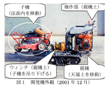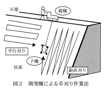 | [要約] | 法面の天端上を移動する親機に吊り下げられた子機が法面内を移動しながら法面内の草刈りを行う機械である。オペレータは天端上で親機を操作することにより法面内の草刈りを行うことができ、刈払機と同等以上の作業能率で軽作業化が可能となる。 |
