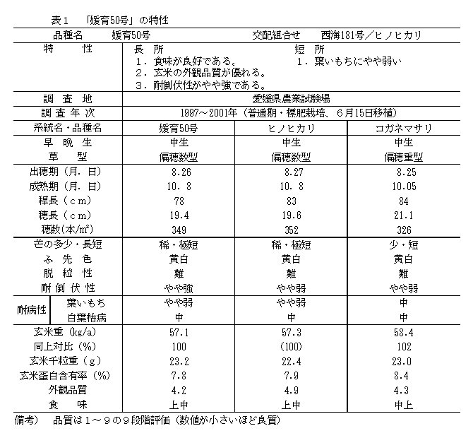 | [成果情報名] | 中生の水稲新品種「媛育50号」 |