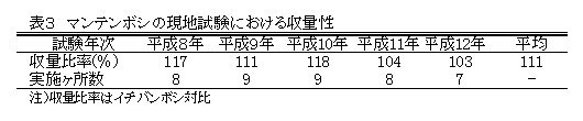 | [要約] | マンテンボシは出穂期、成熟期ともイチバンボシよりやや遅い早生の裸麦である。品質が良好で、耐倒伏性が強く、多収である。県下の裸麦生産地域における適応性も高く、奨励品種に採用し普及をはかる。 |