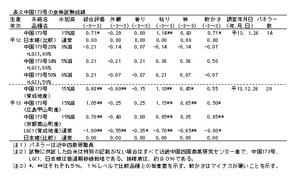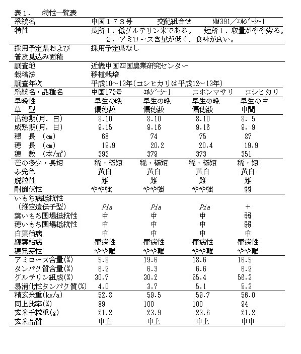 | [成果情報名] | 良食味の低グルテリン米水稲新品種候補系統「中国173号」 |