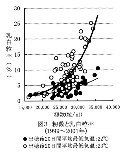 | [要約] | 「コシヒカリ」の乳白粒は出穂後20日間の平均最低気温が高いほど、また籾数が多いほど発生が多くなる。出穂後20日間の平均最低気温が23℃となる場合、乳白粒の発生を6%未満に抑制するには籾数を平方メートル当たり25,000粒以下に制御する必要がある。 |