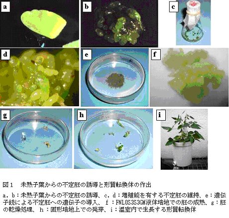 | [要約] | アメリカ品種Jackの未熟子葉から高い増殖能を有する不定胚を誘導する。ハイグロマイシン抵抗性遺伝子と目的遺伝子を接続し、遺伝子銃法により不定胚へ導入する。ハイグロマイシンによる選抜により、安定的に形質転換体を作出することができる。 |