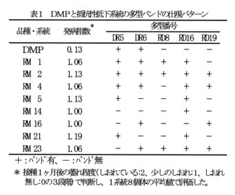 | [要約] | ナス青枯病抵抗性の「DMP」の培養変異体を用いて、シークエンスゲルを用いたDIG-RAPD法により抵抗性に関する多型バンドを検出する。アガロースゲルによる電気泳動で安定的に遺伝子診断ができるように、STS化プライマーを作成する。 |