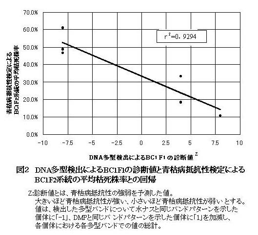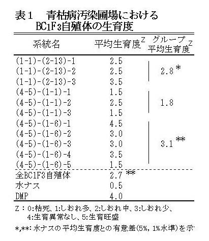| [要約] | 水ナスとナス青枯病抵抗性の「DMP」との戻し交雑体系統において、果実特性による選抜を行った後、それらの個体のDNA多型検出を行い、DMPの遺伝子の割合の多い個体をさらに選抜すると、ナス青枯病抵抗性の水ナスが育成できる。 |