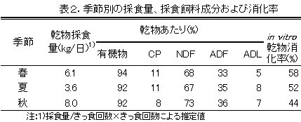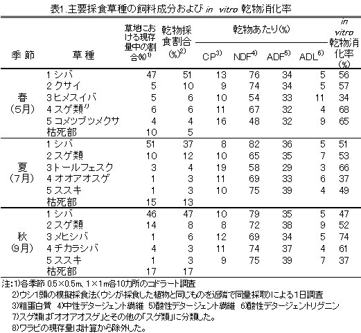 | [成果情報名] | シバ型草地放牧の季節別の採食草種、飼料成分およびin vitro 消化率 |