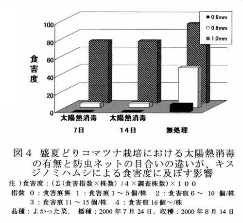 | [要約] | この栽培体系は、ホウレンソウでは雨よけ資材に近紫外線カットフィルムを被覆し、シードテープによる溝底播種を行うことにより、収量の向上、省力化が図れる。コマツナでは簡易太陽熱消毒7日間処理と0.8mm防虫ネットで雑草と害虫が防除できる。また、本体系の施肥は発酵鶏糞堆肥のみ連年施用で化成肥料と同等以上の収量が得られる。 |