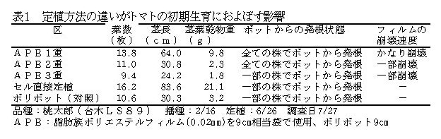 | [要約] | トマトのセル成型苗直接定植において、生分解性フィルムを定植ポットあるいは根域制御シートとして利用することで、初期の生育を制御して安定栽培が可能になる。 |