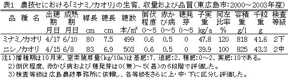 | [要約] | 小麦「ミナミノカオリ」は「ニシノカオリ」と比較して、製パン適性に優れる。成熟期は同程度からやや遅いが多収であり、準奨励品種に採用する。 |
