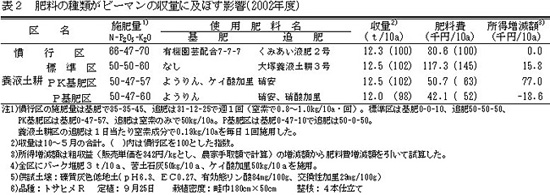 | [要約] | 点滴チューブを用いた施設ピーマン(促成)の養液土耕栽培で、窒素施用量を慣行栽培の70~76%に低減しても、慣行栽培とほぼ同等またはそれ以上の収量が得られ、施肥効率も向上する。また、単肥が利用可能なほ場では肥料費を40~50%削減できる。 |