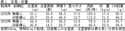| [要約] | 丹波黒大豆において、育苗時に初生葉節の下で摘心すると茎が細く、直立性の強い草姿になり、小型機械(ビーンハーベスタとビーンスレッシャ)による刈取同時脱粒作業の能率が向上するとともに損失粒が減少する。 |
