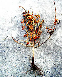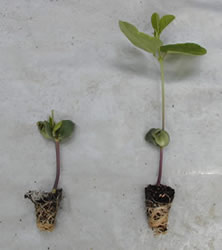| 図1 幼苗摘心株と無摘心株(定植期:写真左、成熟期:写真右) | ||