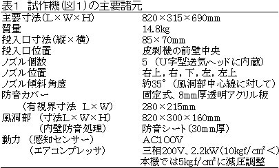 | [要約] | 送気ノズルより吐出される高速気流を効率よくネギに当てるとともに、これまで音漏れの多かった投入口の空隙を制限する送気装置を考案し、作業者の耳元騒音を従来機よりも約5dB低下できる低騒音白ネギ皮剥機を開発した。 |