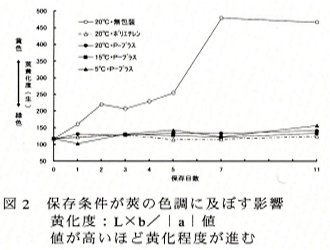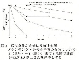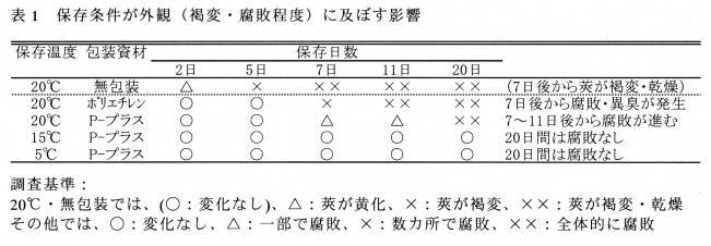 | [要約] | 丹波黒大豆エダマメは主に枝付きの荷姿で出荷される。常温(20℃)・無包装では鮮度低下が著しく1日で食味が低下するが、作製した枝付き形態用鮮度保持フィルム包装と低温保存(15℃~5℃)を組み合わせることで、11日間の鮮度保持が可能となる。 |