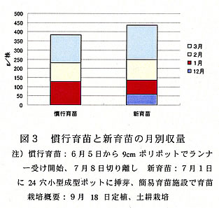 | [要約] | 本技術は、高設親株から発生するランナーの本葉1~3枚の子苗を6月下旬~7月上旬に採苗し、イチゴ専用培土を詰めた小型成型ポットに挿し、その後、ミニパイプハウスを利用した簡易な雨よけ育苗を行う方法であり、省力的で、病害にも罹病しにくい。 |