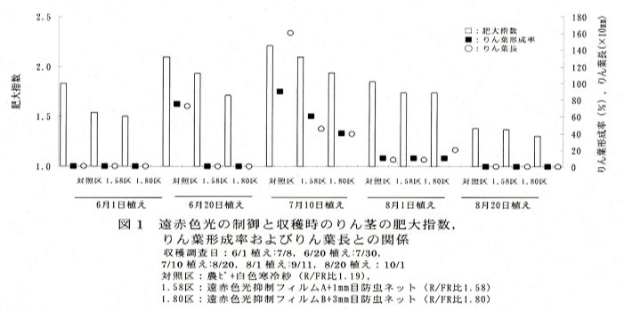 | [要約] | ワケギの夏どり栽培において、FR(Far Red 730±5nm)を低下させてR(Red 660±5nm)/FR比を高めること、また、紫外線を除去することにより、りん茎の肥大を抑制させることができる。 |