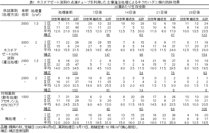 | [成果情報名] | 養液土耕用点滴チューブを用いたホスチアゼート液剤の土壌灌注によるキクのハダニ類の防除 |