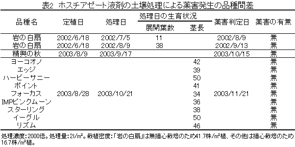 | [要約] | 養液土耕用点滴チューブを用いてホスチアゼート液剤2000倍液を2l/m2土壌灌注することにより、キクのハダニ類が省力的に防除できる。 |