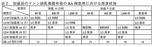 | [成果情報名] | ハウススダチ加温前のマシン油乳剤散布が発芽・着花に及ぼす影響 |