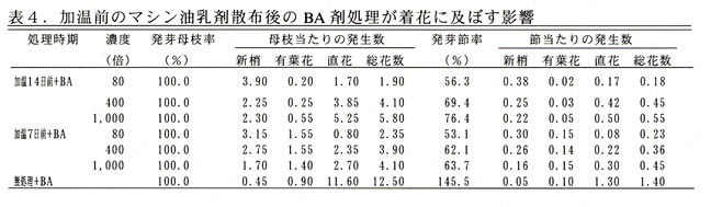 | [要約] | ハウススダチ加温前のマシン油乳剤(97%)散布は発芽を遅らせ、着花数を減少させる。これはマシン油乳剤散布後にBA剤処理しても同様に発芽を遅らせ、着花数を減少させる。 |
