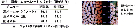 - ペレット単味での給与が可能で、繁殖雌牛の採食し好性は、生の酒米中ぬかよりも単位時間内の採食率が約60%向上し配合飼料に匹敵する(表2)。
