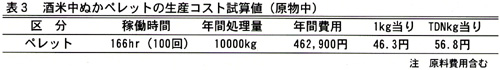 - 造粒機1時間の稼働で100kg程度のペレットを製造可能で、生産コストは1kg当たり労働費を含め46.3円で調製できる(表3)。