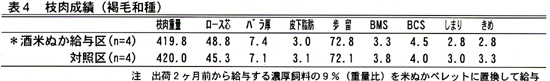 - ペレットの利用は、肥育牛の出荷2ヶ月前からとし、給与する濃厚飼料の9%(重量比)までをペレットに置換しても枝肉成績に差が認められない(表4)。
