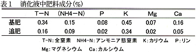 - 供試消化液の肥料成分は窒素の約半分がアンモニア態窒素で、残りは有機態窒素と考えられる。リン、マグネシウム、カルシウムの含有率は低く、カリウムは高い(表1)。
