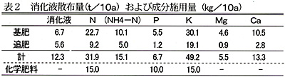 - 10a当たりの肥料成分施用量は、消化液中のアンモニア態窒素を基準としたため、化学肥料と比べて窒素が約2倍、カリウムが約3倍と多く、リンは少ない(表2)。