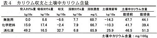 - カリウムは過剰施用となるが、作物吸収量、溶脱カリウム量ともに化学肥料施用より少なく、多くは土壌に残存する(表4)。