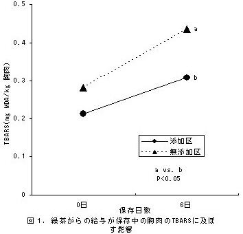 - 緑茶がら添加は、保存後の筋中の脂質酸化度(2-チオバツビツール酸反応物質:TBARS)が有意に低く(P<0.05)、脂質の酸化を抑制する(図1)。