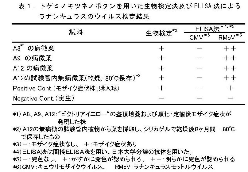 | [成果情報名] | 生物検定によるラナンキュラスモットルウイルス(RMoV)のフリー化の確認 |