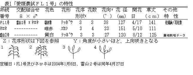 | [成果情報名] | 花柱切断受粉法と胚珠培養を用いたユリ新品種「愛媛農試FL1号」の育成 |