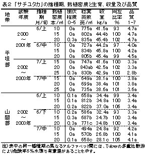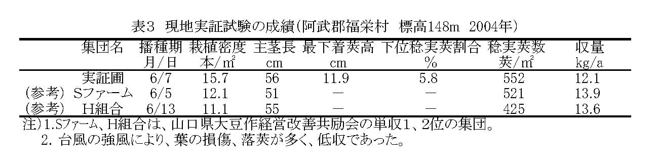 | [成果情報名] | 大豆品種「サチユタカ」の高品質安定生産のための播種期、栽植密度 |