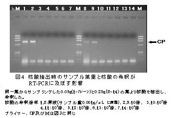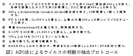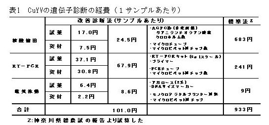 | [要約] | 一本鎖RNAのキュウリ黄化ウイルス(CuYV)はRT-PCRにより遺伝子診断が可能である。ウイルスの核酸抽出液を自家調整し、核酸抽出のためのサンプル重量とRT-PCRの反応液量を微量化することにより、1サンプルあたり約100円でウイルスが検出できる。 |